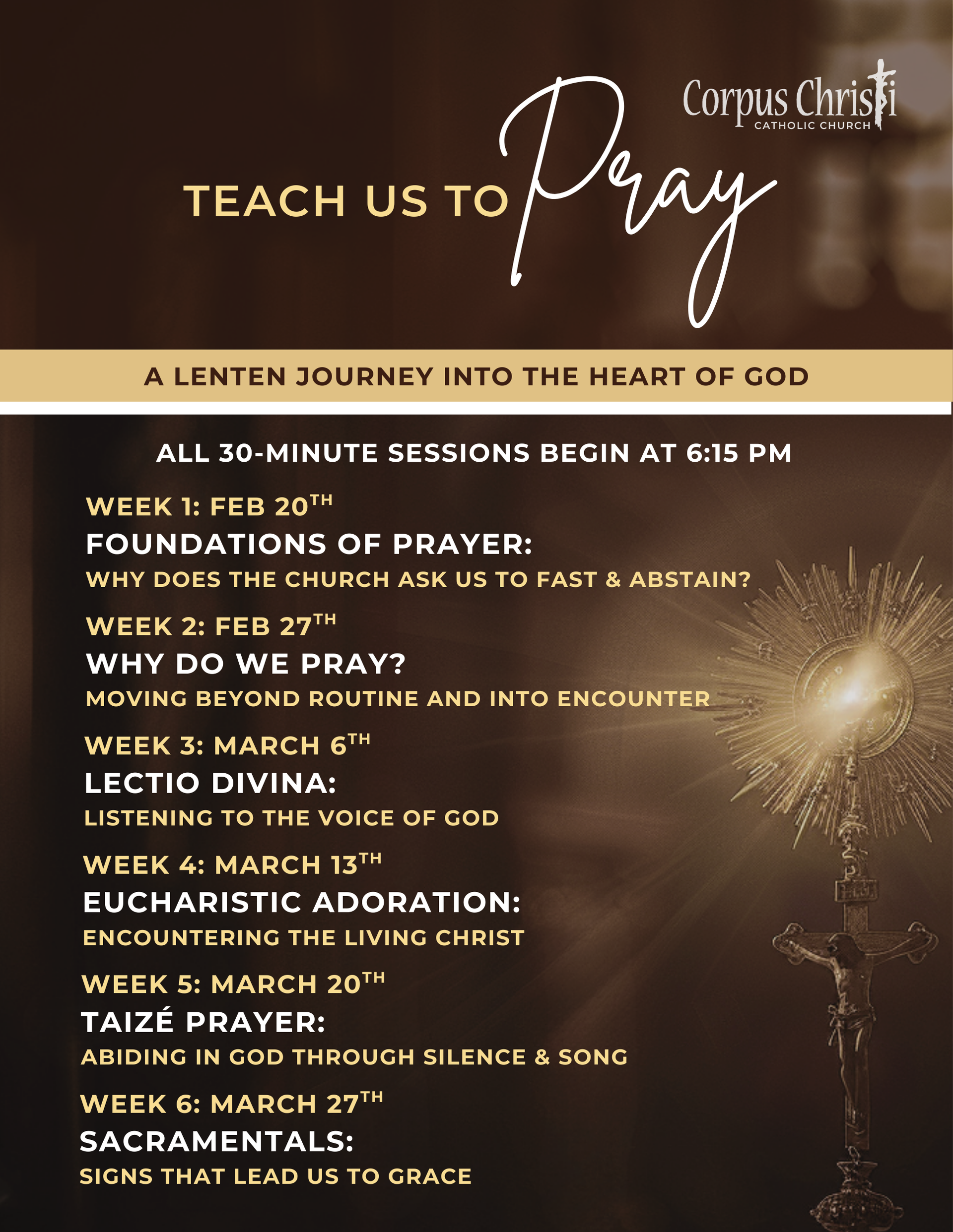 All 30-minute sessions begin at 6:15PM in the church
